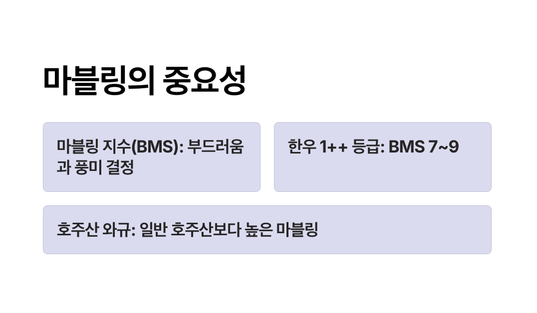 - 근내지방도(마블링): 고기 속에 하얀 지방이 얼룩처럼 퍼져 있는 정도
