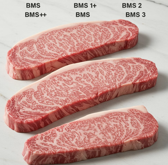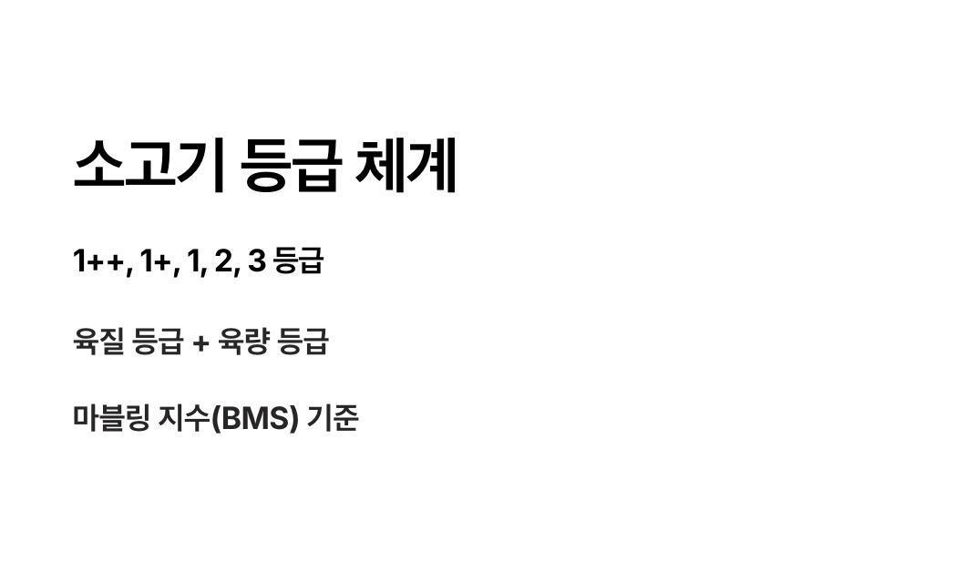 이런 항목들을 종합해, 소고기는 1++, 1+, 1, 2, 3등급, 돼지고기는 1+, 1, 2등급으로 나눕니다. 등급이 높을수록 일반적으로 고기가 부드럽고 육즙이 많으며, 풍미도 좋습니다.