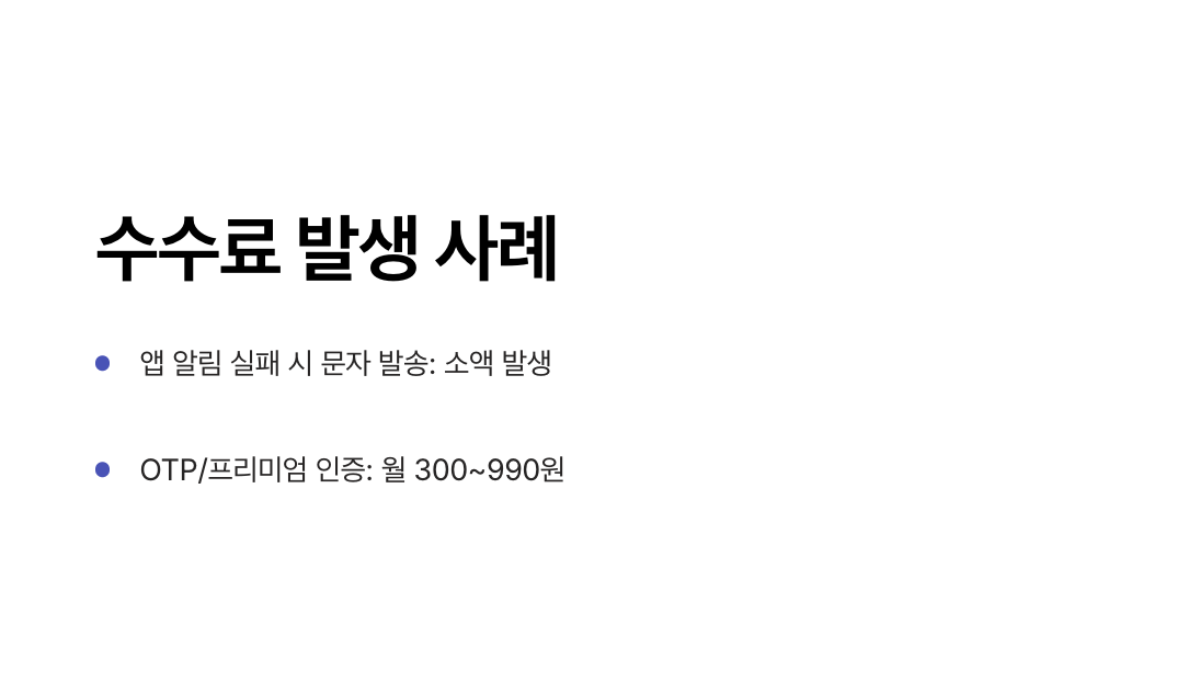 하지만 통신사별로 부가 기능이 포함되거나, 알림 실패 시 문자 대체 발송, 프리미엄 인증 옵션 등을 선택하게 되면 소액의 수수료가 발생할 수 있습니다.