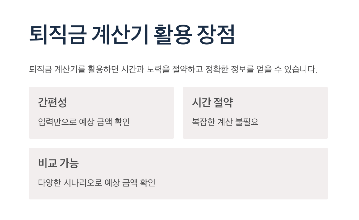 - 간편함: 몇 가지 입력만으로 예상 퇴직금을 쉽게 확인할 수 있습니다.