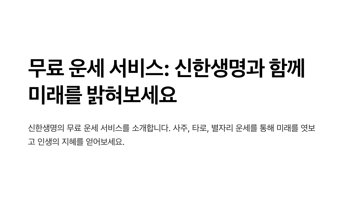 지금 바로 신한생명 공식 웹사이트나 모바일 앱을 통해 무료 운세 서비스를 체험해보세요. 새로운 해, 새로운 통찰로 당신의 삶을 더욱 풍요롭게 만들어보길 바랍니다!