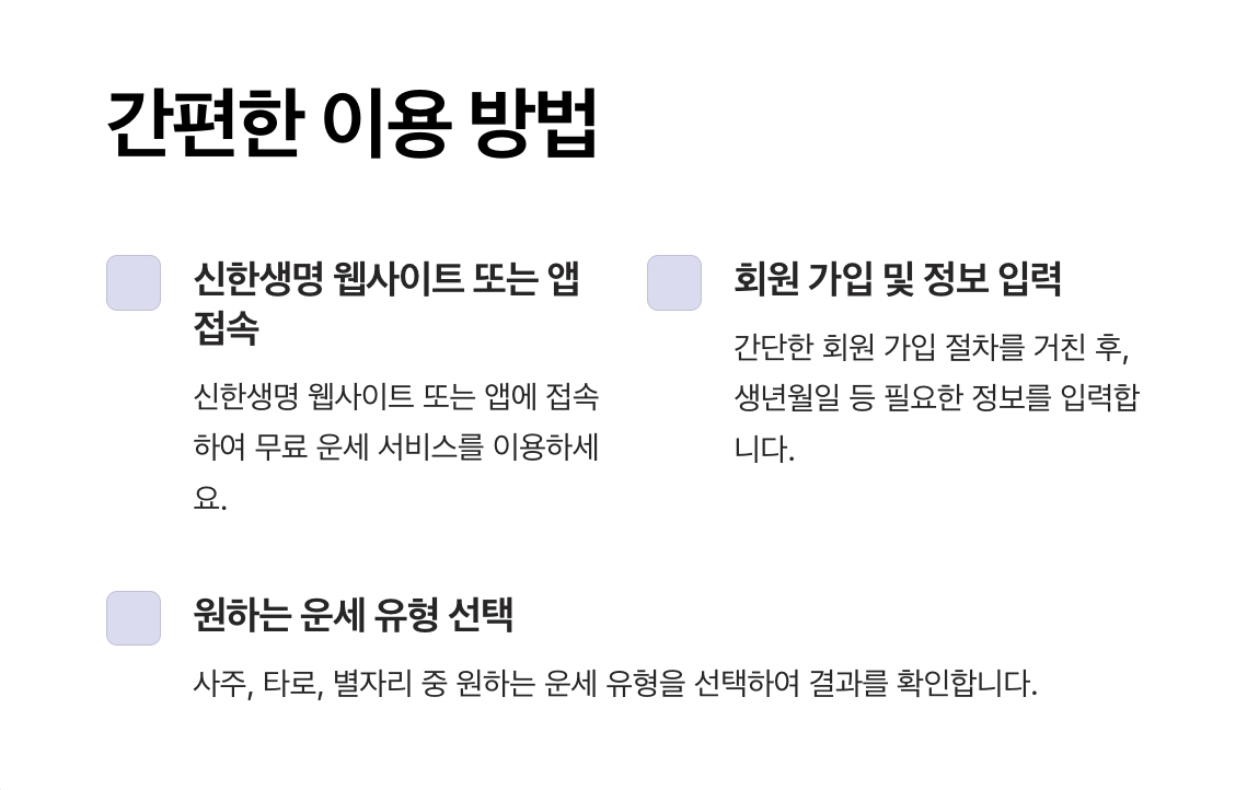 신한생명의 무료 운세 서비스는 세 가지 주요 운세 유형으로 구성되어 있으며, 각각 고유한 방식으로 사용자에게 정보를 제공합니다.