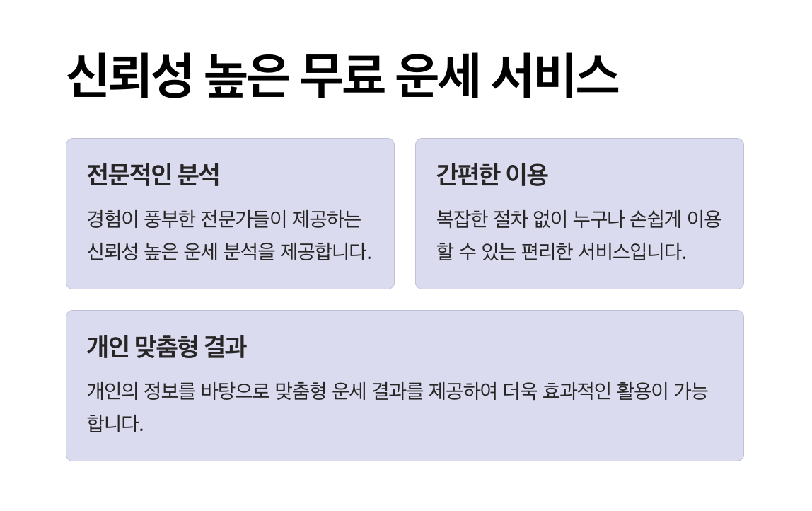 - 무료 이용: 누구나 간단히 접근 가능하며, 경제적 부담 없이 전문 운세 서비스를 이용할 수 있습니다.