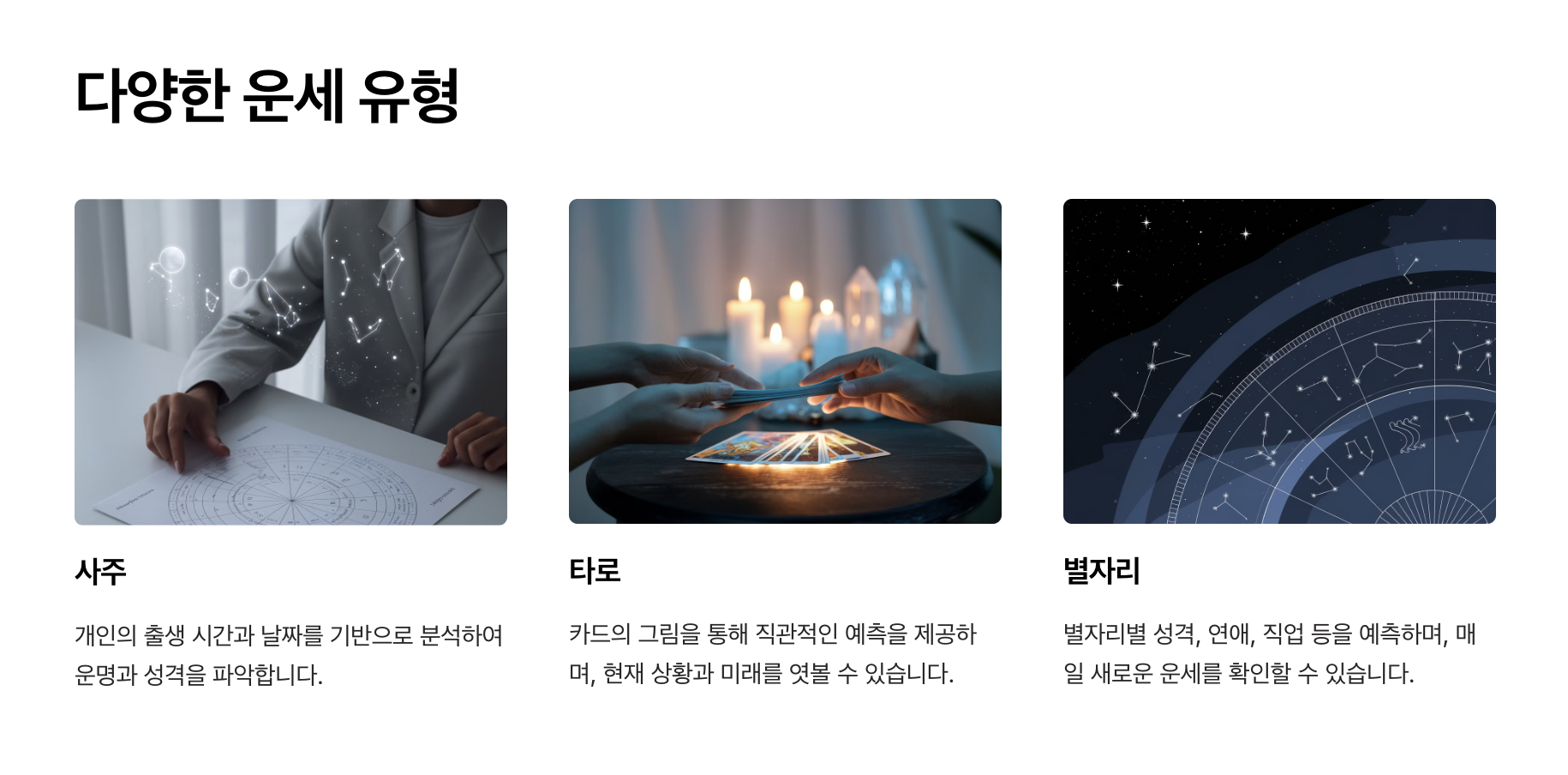 - 특징: 천문학적 정보를 기반으로 개인의 성격, 연애, 직업운 등을 예측.