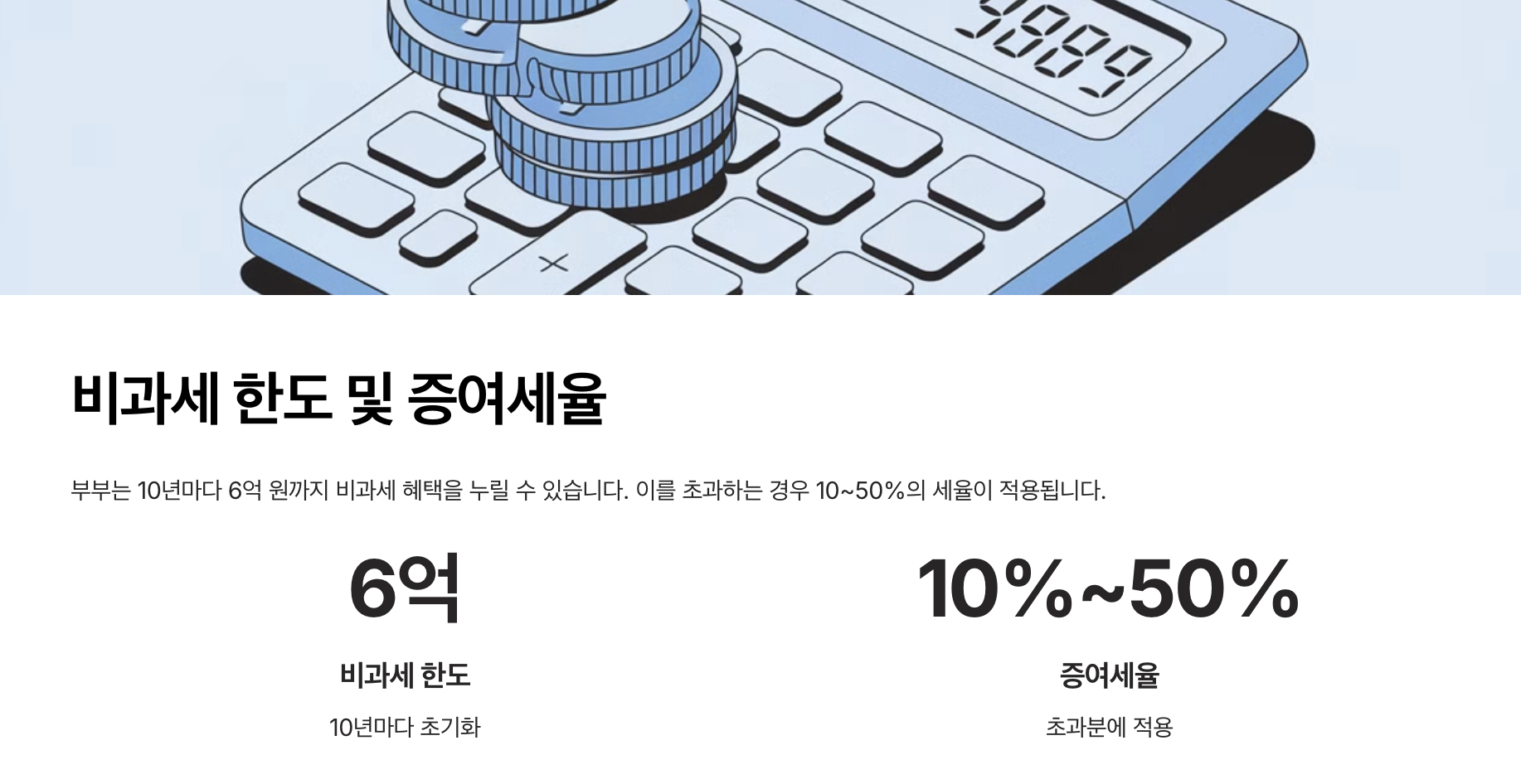 즉, 부부간에는 최대 6억 원까지 증여세가 부과되지 않습니다. 이 한도를 초과하는 금액에 대해서는 증여세율이 부과됩니다.