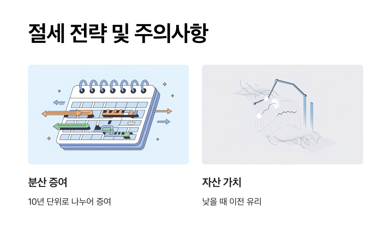 - 자산 가치가 낮을 때 증여: 주식, 부동산 등의 가치가 낮을 때 증여를 진행하면 과세 표준이 줄어 세금 부담이 감소합니다.