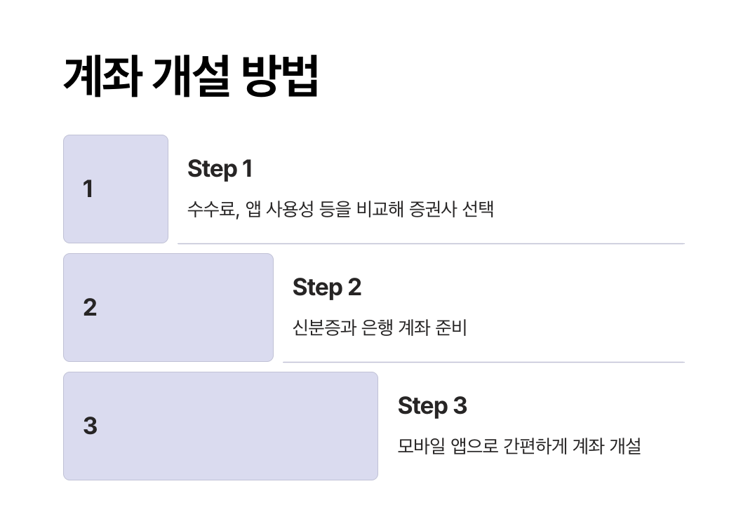 - 증권사 모바일 앱을 설치한 뒤, 안내에 따라 간단히 정보를 입력하고 인증을 완료하면 계좌가 개설됩니다.