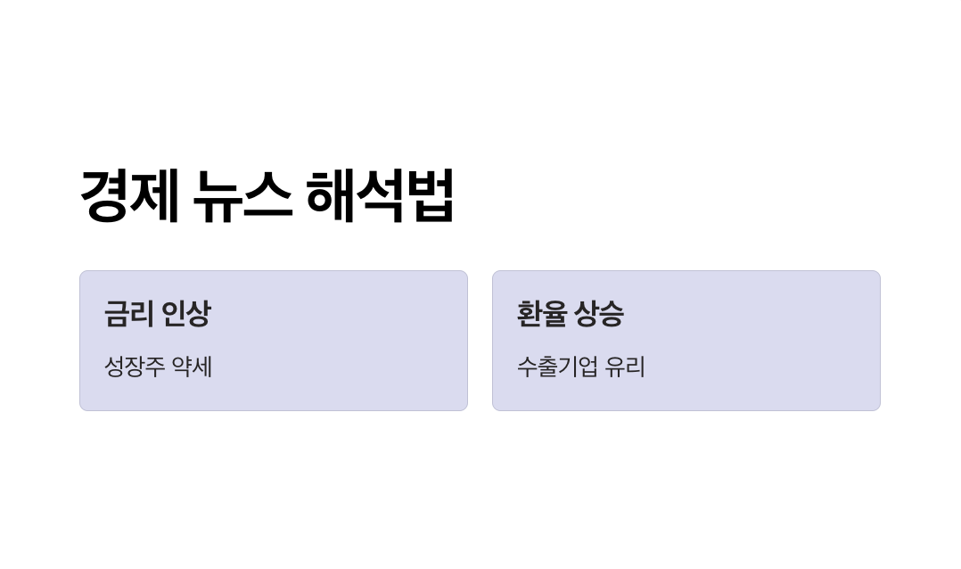 - 원화 약세(환율 상승): 수출기업에 유리, 수입기업에는 부정적.
