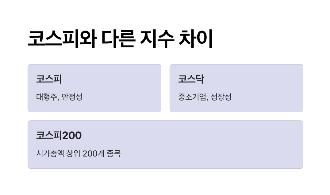 - 코스피200: 코스피 상장사 중 시가총액과 유동성이 높은 200개 종목으로 구성, 파생상품 기초지수로 활용.