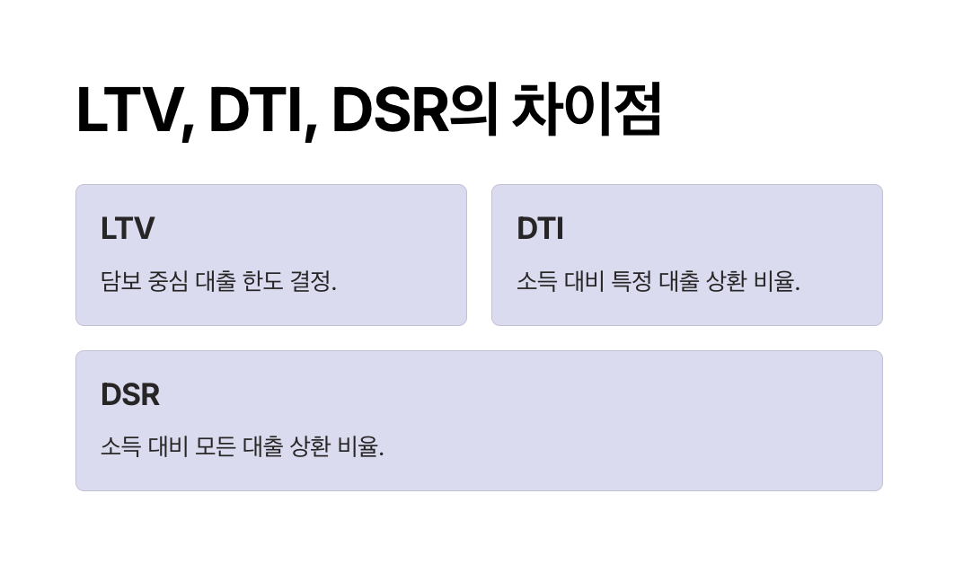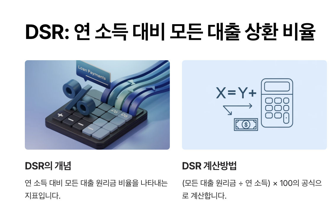 - DSR: 신용대출, 자동차 할부금 등 모든 대출을 포함해 포괄적으로 평가.