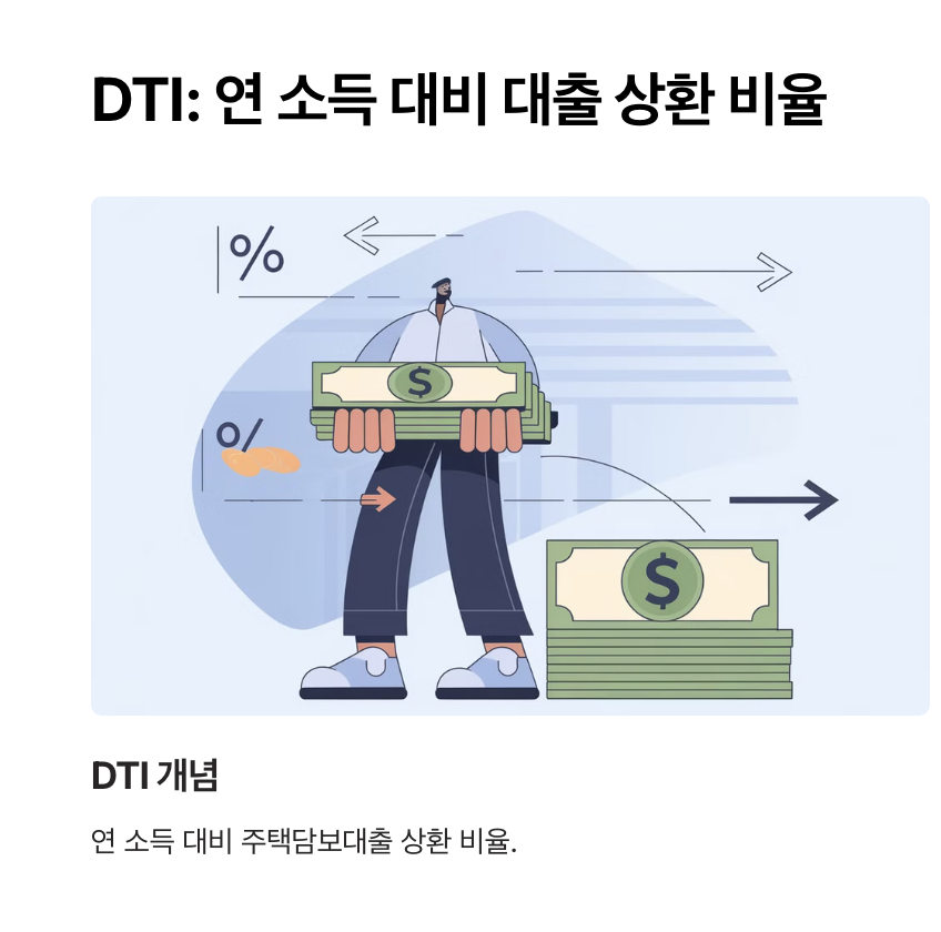 - DTI: 소득 대비 특정 대출의 상환 부담 평가.