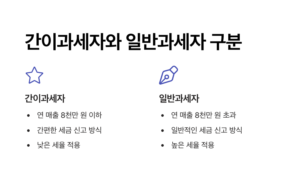 - 특징: 과세율이 0.5~3%로 낮고, 신고 절차가 간소화되어 있습니다. 다만, 매입세액 공제가 불가능합니다.