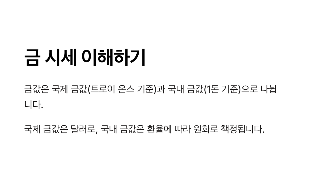 - 국내 금 시세: 국제 금 시세와 환율, 세금, 국내 수요와 공급을 반영하여 금값이 결정됩니다.