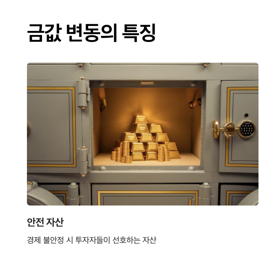 전쟁, 테러, 글로벌 경제 위기 등 불확실한 상황에서는 금이 안전 자산으로 주목받아 금값이 상승합니다.