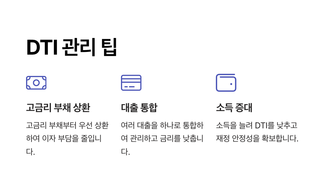 부업이나 투자 등으로 추가 소득을 확보하여 DTI 개선에 도움을 줄 수 있습니다. - 경력 개발:
