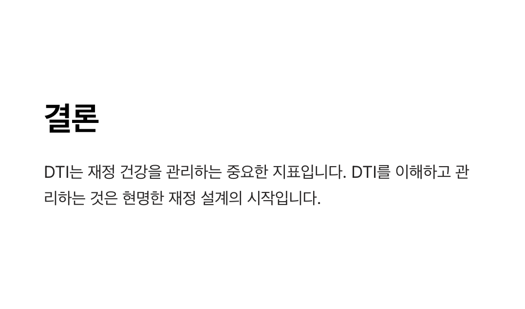 이번 글을 통해 DTI의 개념과 계산법, 관리 팁을 이해하셨다면, 앞으로 대출과 관련된 의사결정을 할 때 더욱 유리한 위치에 설 수 있을 것입니다. 간단하지만 놓치기 쉬운 DTI, 지금 자신의 비율을 확인하고 철저히 관리해 보시길 바랍니다.