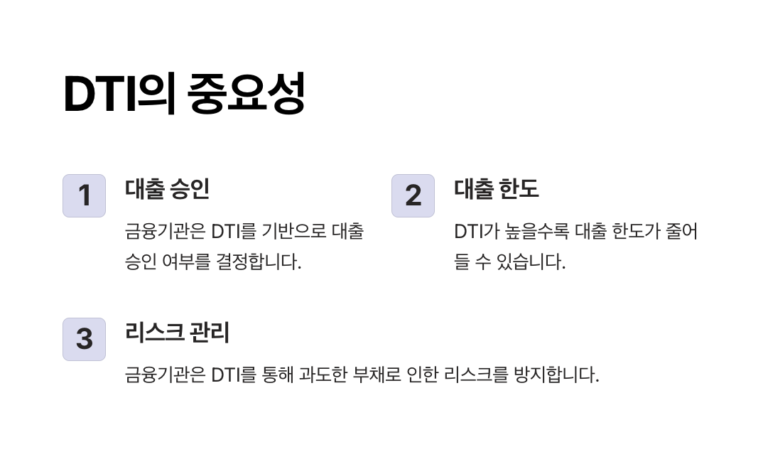 금융기관은 대출 신청자의 DTI를 통해 부채 상환 부담을 판단합니다. 높은 DTI는 상환 능력이 낮다고 간주되어 대출 승인이 거절되거나 낮은 한도의 대출만 가능해질 수 있습니다. - 리스크 관리: